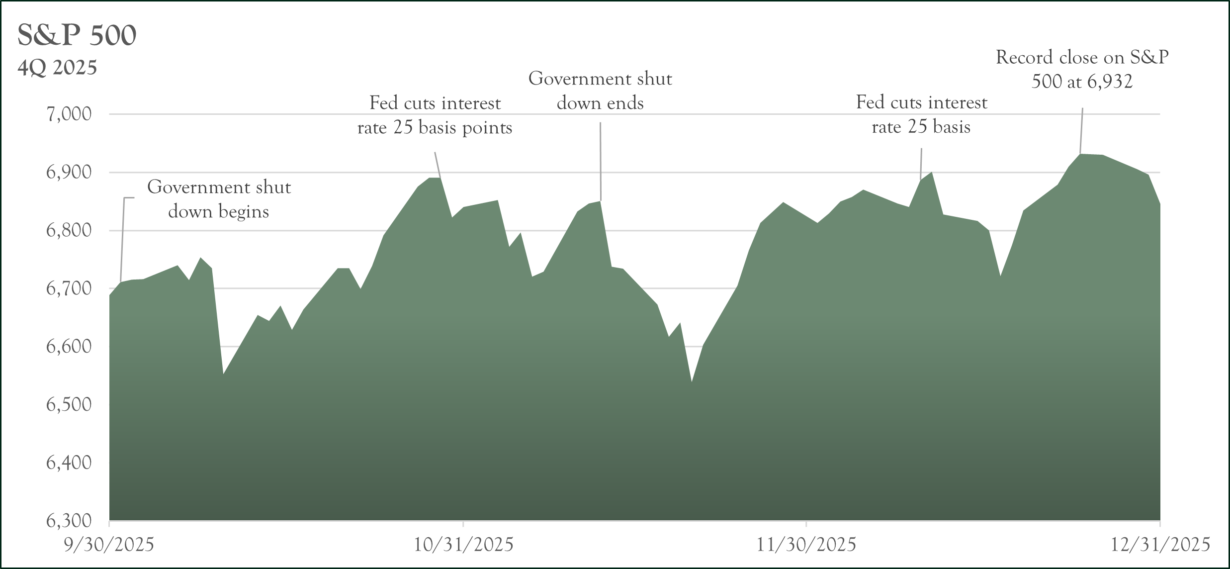 Equity markets maintained their upward trajectory despite concerns over a U.S. government shutdown and low consumer sentiment. The S&P 500 rose by 2.7% during the fourth quarter and ended 2025 with a gain of 17.9%, a third consecutive year of double-digit returns for the broad-based index. Market performance was driven by the artificial intelligence (AI) buildout, falling energy costs, interest rate cuts, and record corporate profits.